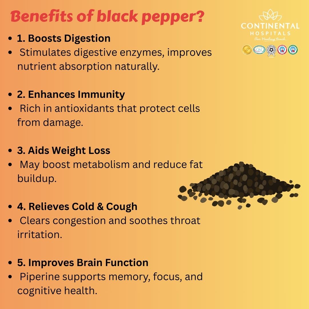 At Continental Hospitals, recognized as one of the best hospitals in Hyderabad, our specialists often highlight the importance of small dietary choices that can make a big difference. Black pepper is one such ingredient. Let us explore the health benefits of black pepper, its nutrition value, and how it supports your overall well being.