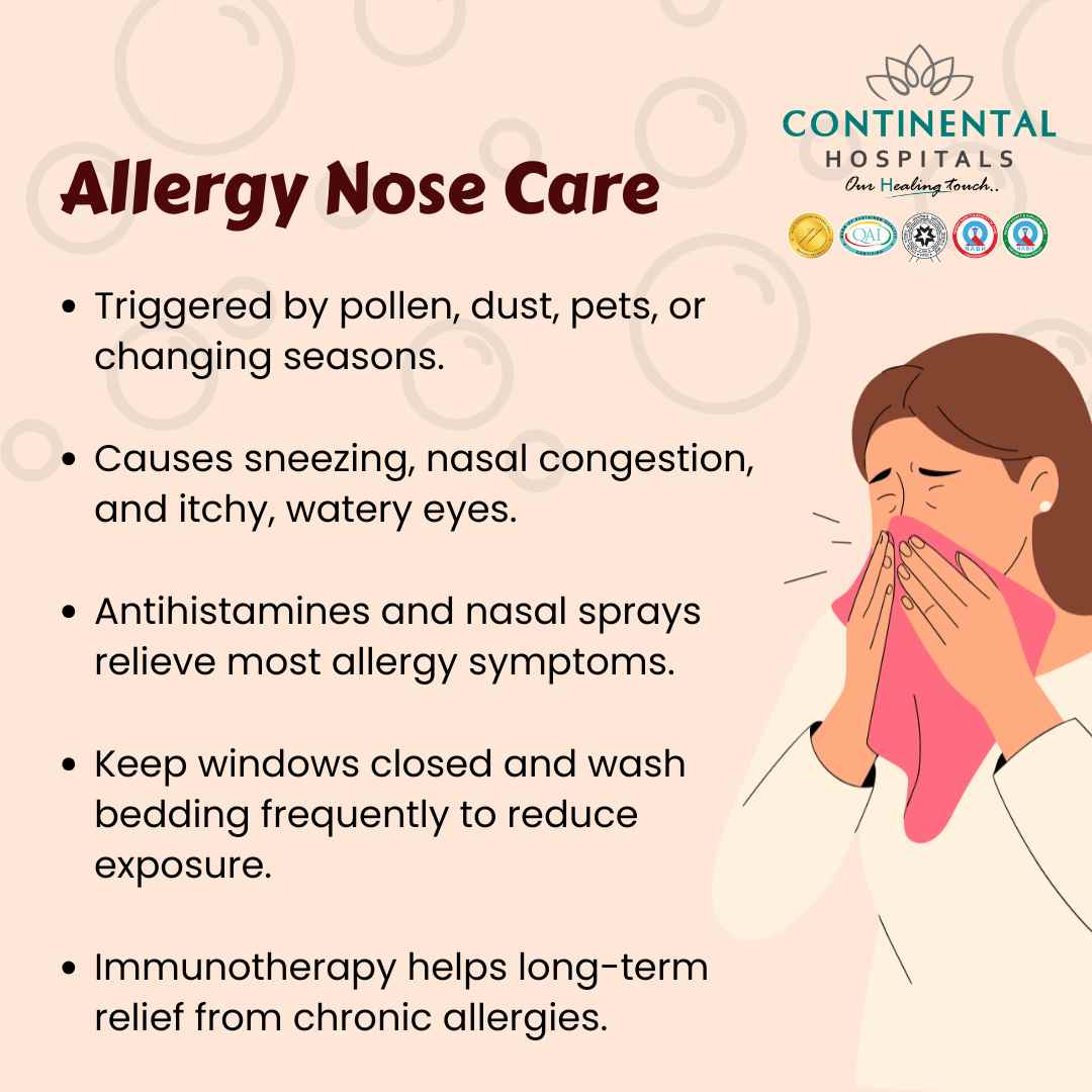 Our team of specialists, including ENT experts and allergists, use cutting-edge technology to identify the root cause of your allergy and design personalized treatment plans. With state-of-the-art diagnostic labs, modern infrastructure, and a patient-centric approach, Continental Hospitals ensures that every patient receives comprehensive care and long-term relief from allergic rhinitis and related respiratory conditions.