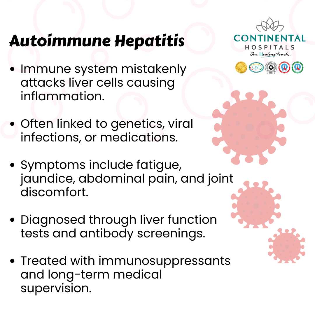 Autoimmune hepatitis is a chronic liver disease that occurs when the bodyâs immune system, instead of protecting us, mistakenly attacks the liver cells. This leads to inflammation, scarring, and eventually liver damage if not diagnosed and treated early. The exact cause is not fully understood, but a combination of genetics, environmental factors, and immune system abnormalities play a major role in triggering this condition.
