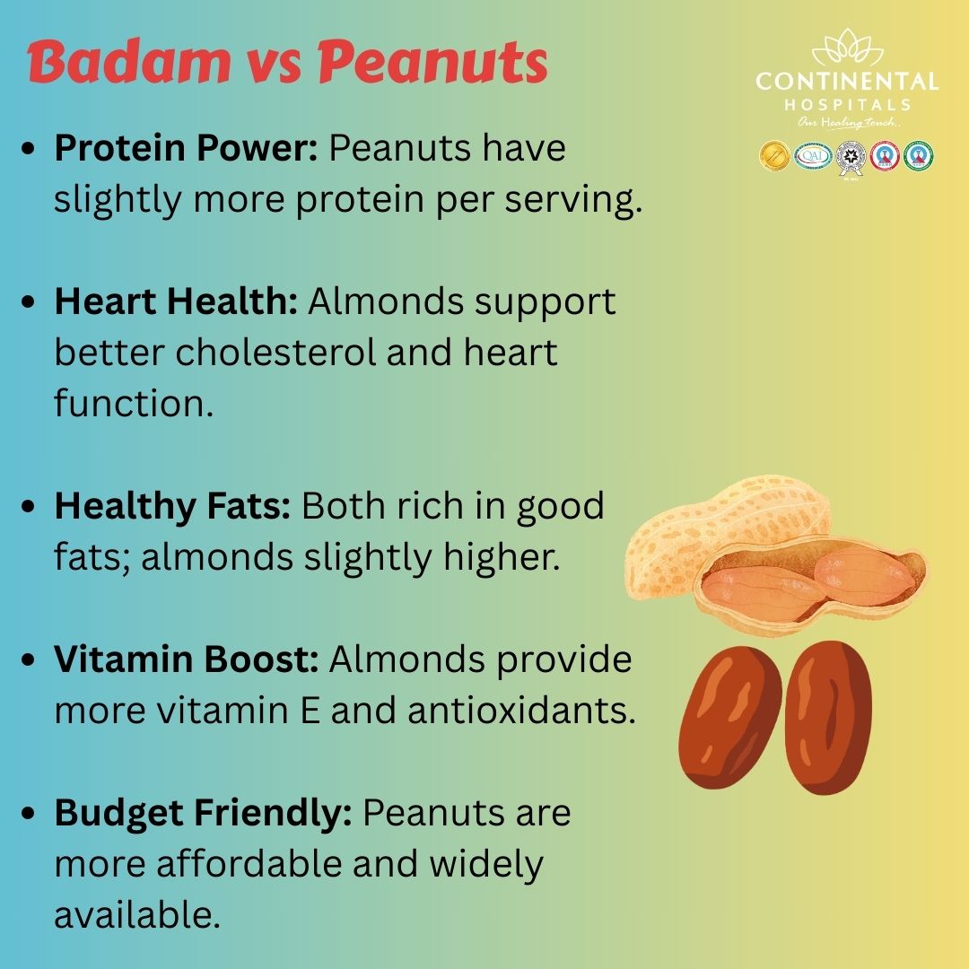 Almonds contain more fiber than peanuts. Fiber helps improve digestion, supports gut health, and keeps you full for longer. If you struggle with constipation or digestive issues, almonds health benefits may be more suitable for you.