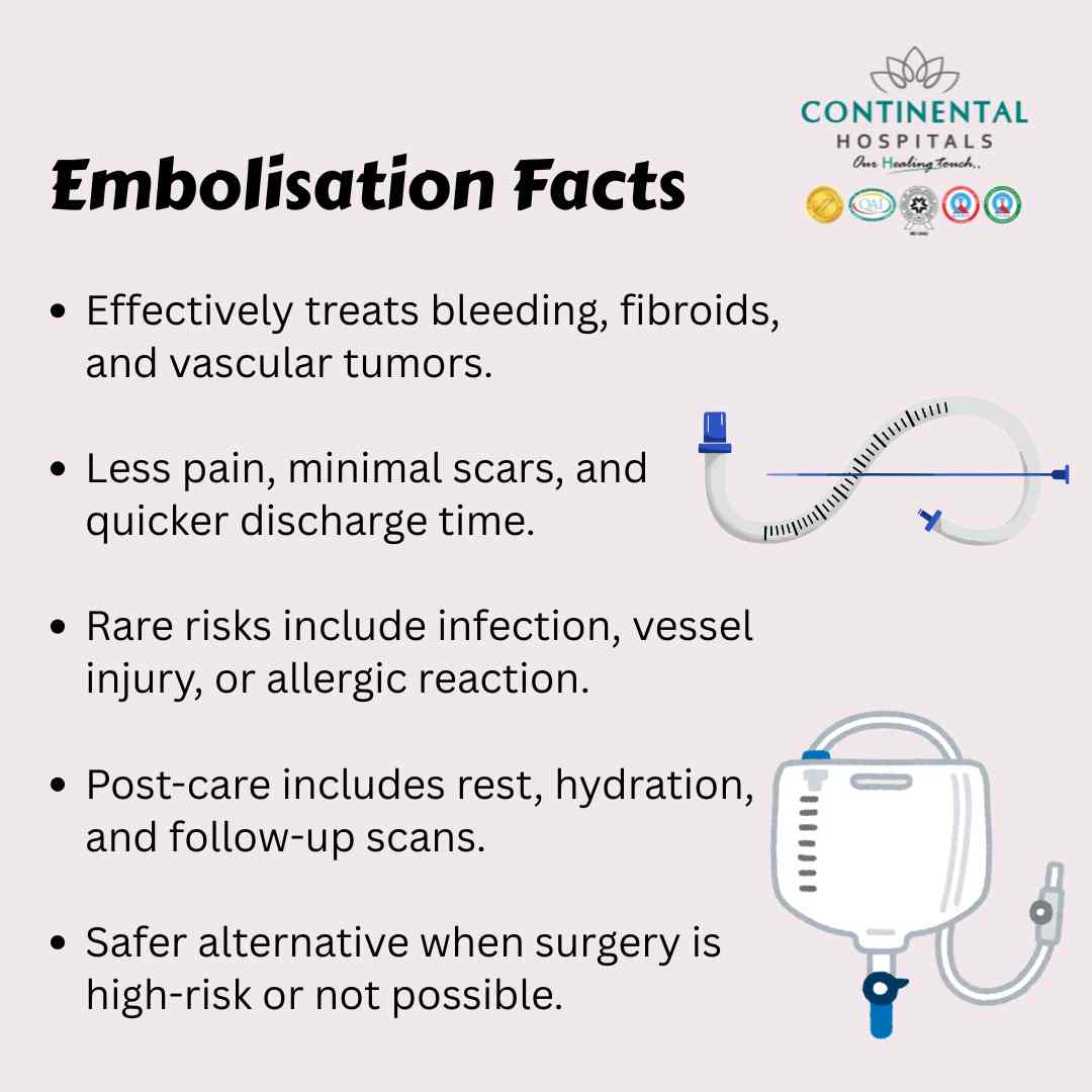 Interventional trans-catheter embolisation is a minimally invasive medical procedure that has transformed the way doctors treat a variety of health conditions. From controlling bleeding to treating tumors, this technique has proven to be safe, effective, and highly targeted. It helps avoid major surgery, ensures faster recovery, and provides relief with minimal discomfort. In this blog, let’s explore what trans-catheter embolisation is, how it works, its benefits, possible risks, and why Continental Hospitals is one of the best places to undergo this advanced procedure.