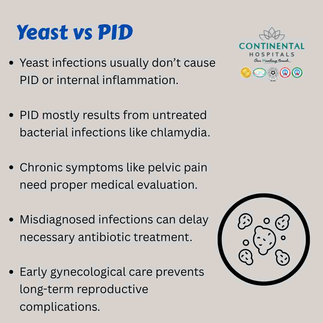 Yeast infections themselves do not cause PID. However, symptoms may sometimes overlap or be misunderstood, delaying correct diagnosis. Also, self-treatment without proper evaluation can mask underlying infections that may progress into PID. Understanding the difference is essential for timely care.