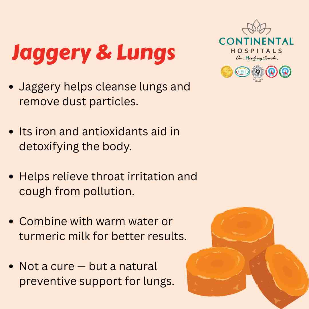 Detoxification of the lungs: Jaggery may help remove tiny particles and pollutants that enter the lungs when you breathe polluted air. Its antioxidant properties can help neutralize harmful free radicals caused by pollution exposure.