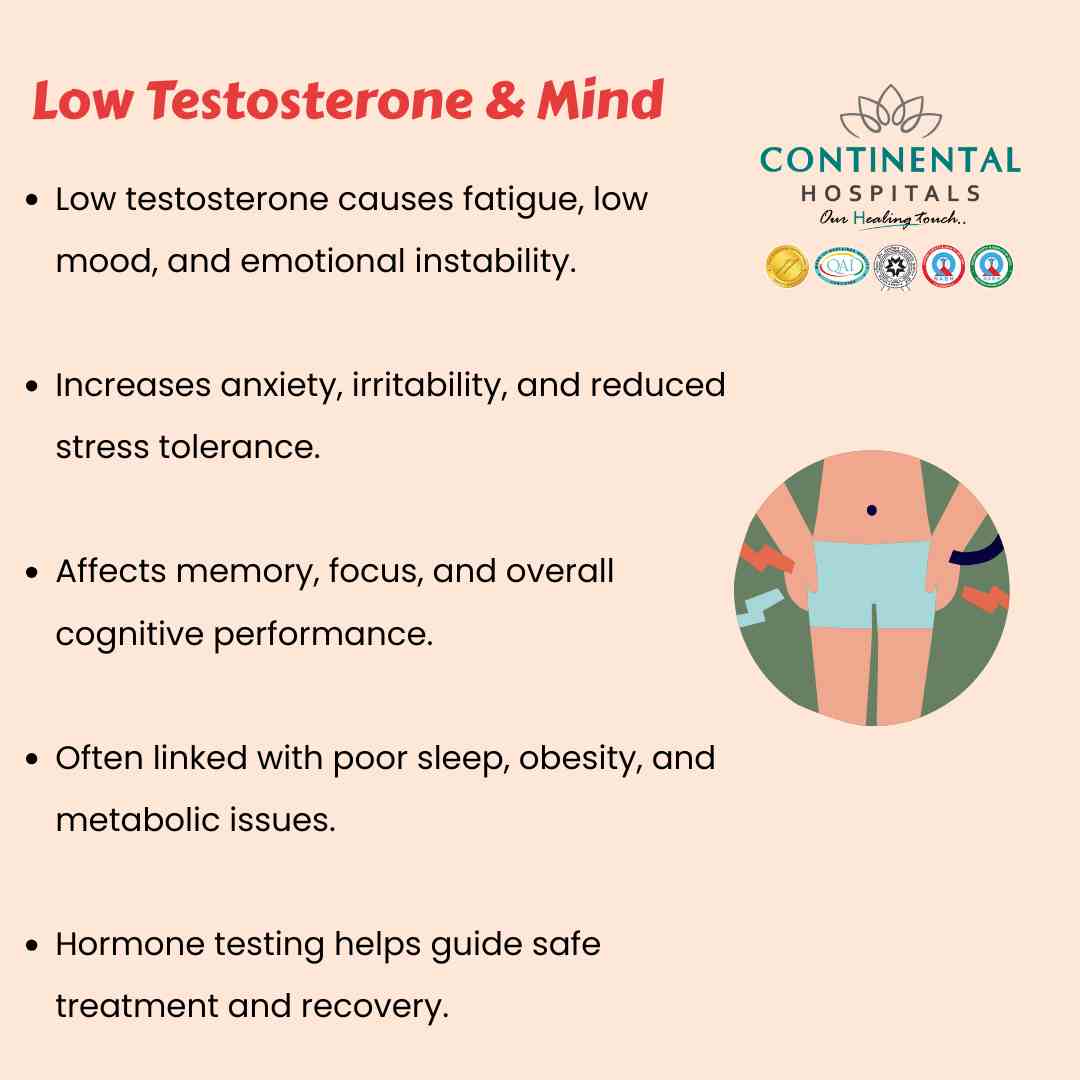 Low testosterone is often spoken about in relation to physical symptoms like low energy, reduced muscle mass, or changes in sexual health. But many people do not realise that testosterone also plays an important role in emotional wellbeing. When levels drop, the mind can be affected just as much as the body. Understanding this connection helps people identify symptoms early and seek timely medical support from experts at Continental Hospitals, one of the best hospitals in Hyderabad.