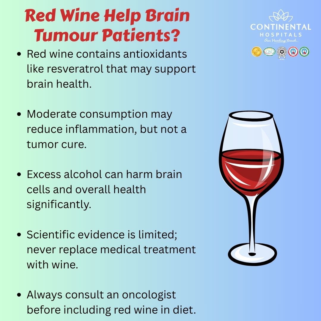 Red wine has received attention for its potential brain health benefits, mainly due to antioxidants like resveratrol. However, it is not a treatment for brain tumours. Patients should rely on professional medical care for effective treatment and use dietary measures only as complementary support. Maintaining a healthy lifestyle, following prescribed treatments, and consulting specialists can make a real difference in patient outcomes.