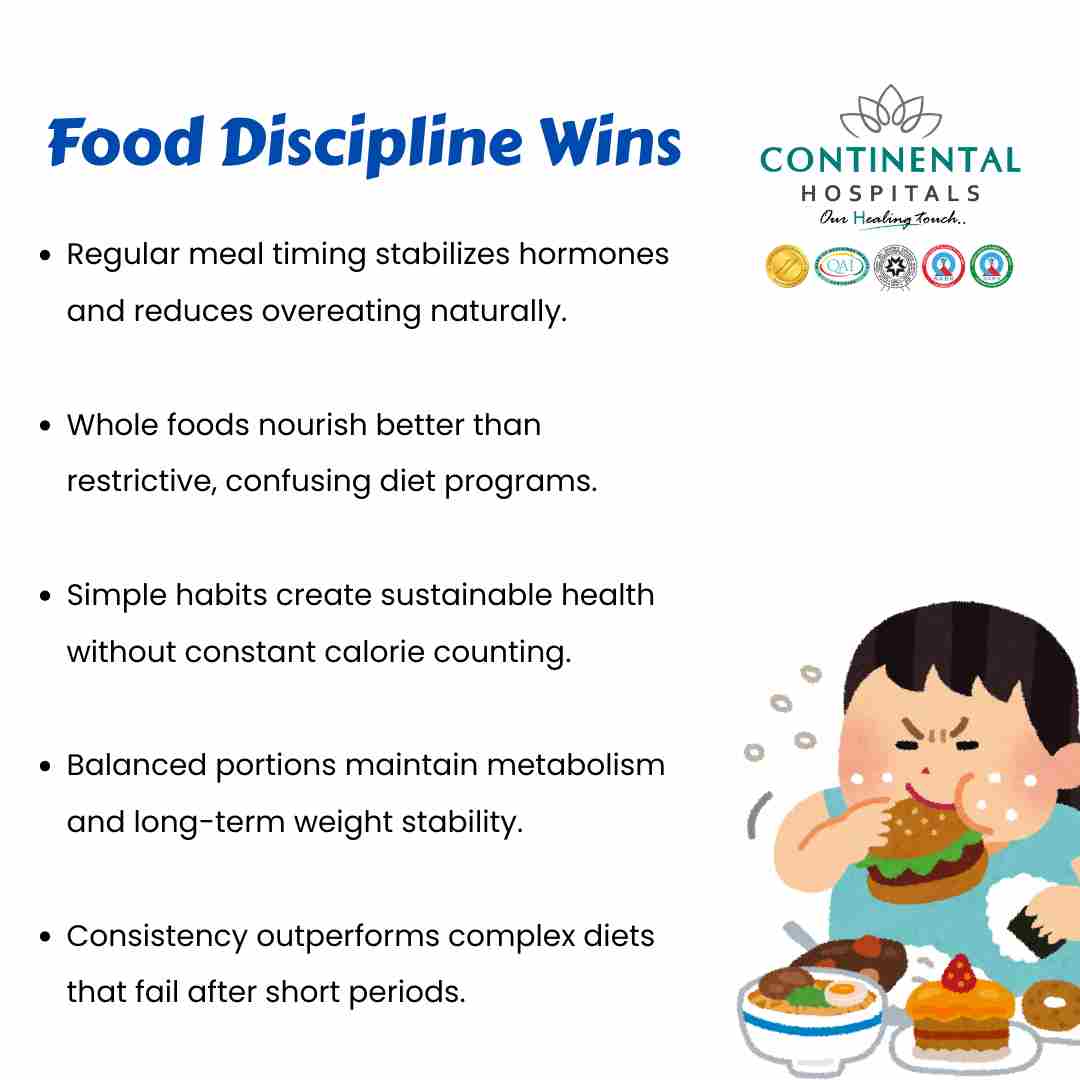 Simple food discipline is more effective than complicated diet plans because it focuses on daily habits, realistic choices, and long-term health. Sustainable eating habits, portion control tips, and mindful eating habits help improve metabolism naturally and support long-term weight control. Instead of following restrictive diets, choosing easy nutrition rules allows you to maintain consistency and build a balanced lifestyle. With the right guidance and support, your journey to better health can be simple and achievable.