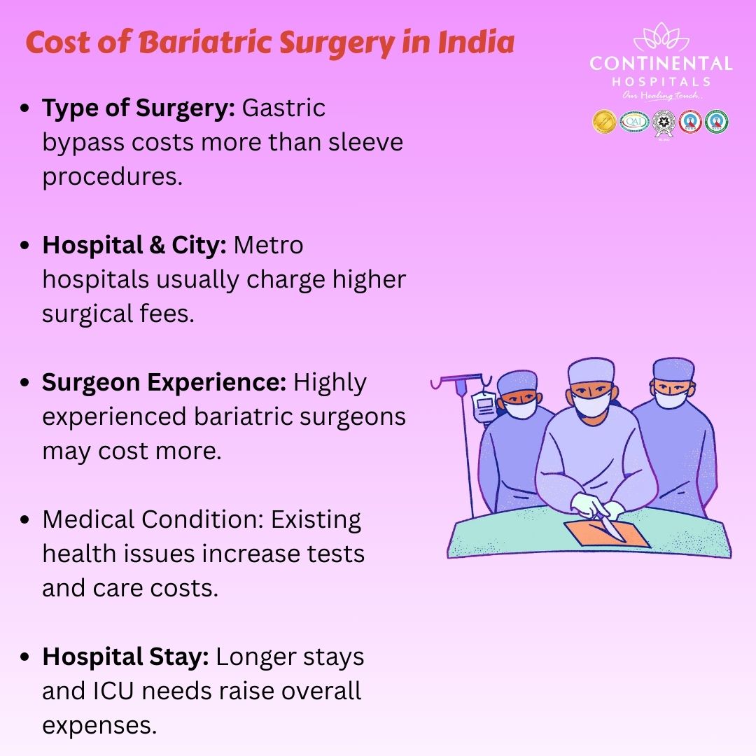The Cost of Bariatric Surgery varies from patient to patient. It is influenced by medical, surgical, and hospital related factors rather than a single fixed element.