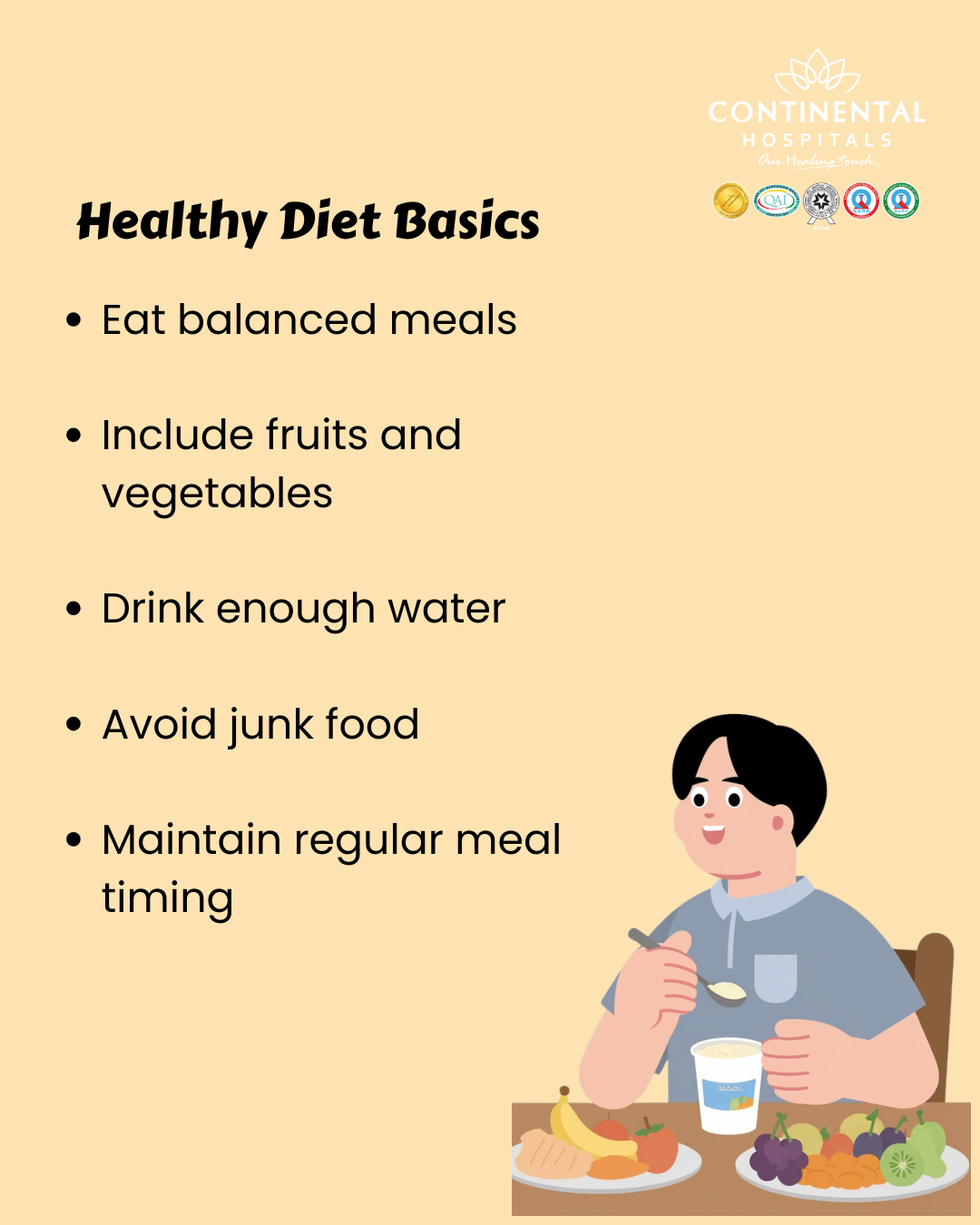 Healthy diet is the cornerstone of a healthy life. It does not require complicated plans or restrictions. Simple, balanced, and mindful eating can lead to long-term benefits. Consistency is key. Making the right food choices every day improves energy levels, strengthens immunity, and enhances overall well-being. If you suffer from nutritional deficiencies, weight management issues, or lifestyle-related health conditions, consult a nutrition specialist or dietician at Continental Hospitals for expert guidance and personalized care.
