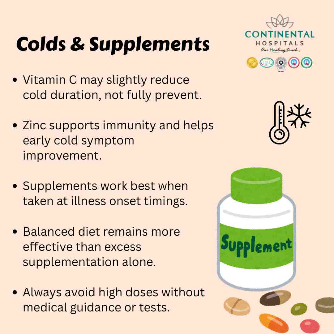 Vitamin C and Zinc play important roles in supporting the immune system and can help reduce the duration and severity of colds. However, they are not magic cures. A balanced diet, proper rest, hydration, and regular health checkups are equally vital for maintaining strong immunity.