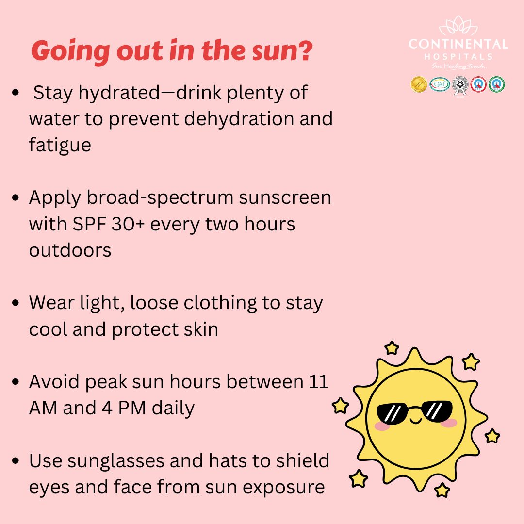 Heatstroke: This is a medical emergency. Symptoms include a high body temperature, confusion, lack of sweating despite the heat, and loss of consciousness. Seek professional medical help at Continental Hospitals immediately if these signs appear.