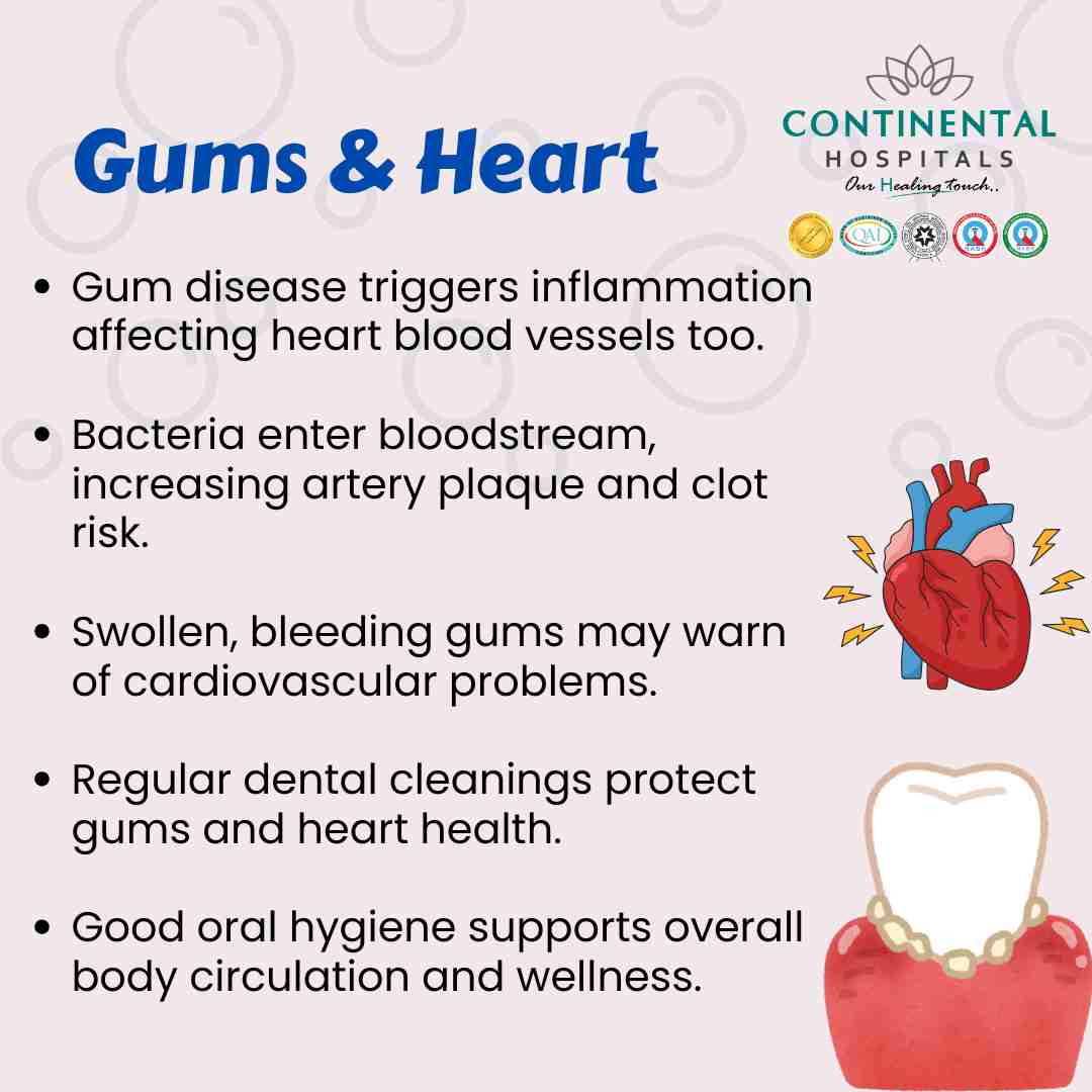 Continental Hospitals, Hyderabad, with its team of expert Dentists and Cardiologists, provides complete care that bridges dental and heart health. Donât ignore gum problems; get professional help today and keep both your heart and smile healthy.