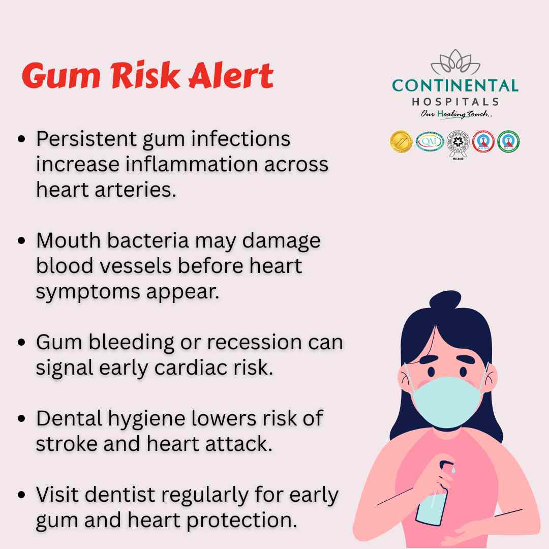 If you suffer from gum disease, chest discomfort, or risk factors like diabetes or high blood pressure, donât wait for symptoms to worsen. Visit Continental Hospitals today for a comprehensive cardiac and oral health evaluation.