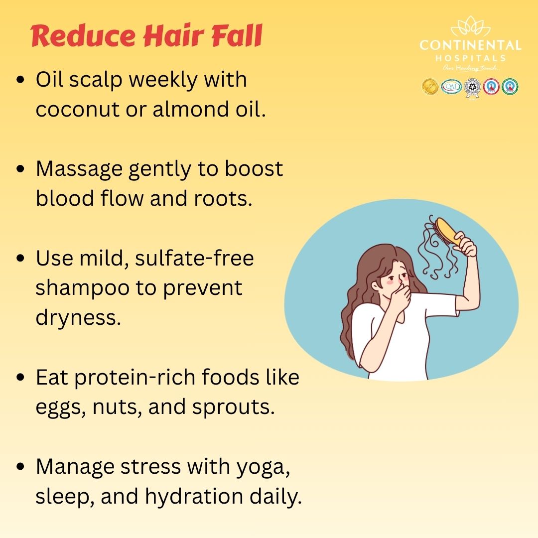 Start with balanced nutrition, gentle hair care, stress management, and scalp hygiene. Early action can reduce hair fall.