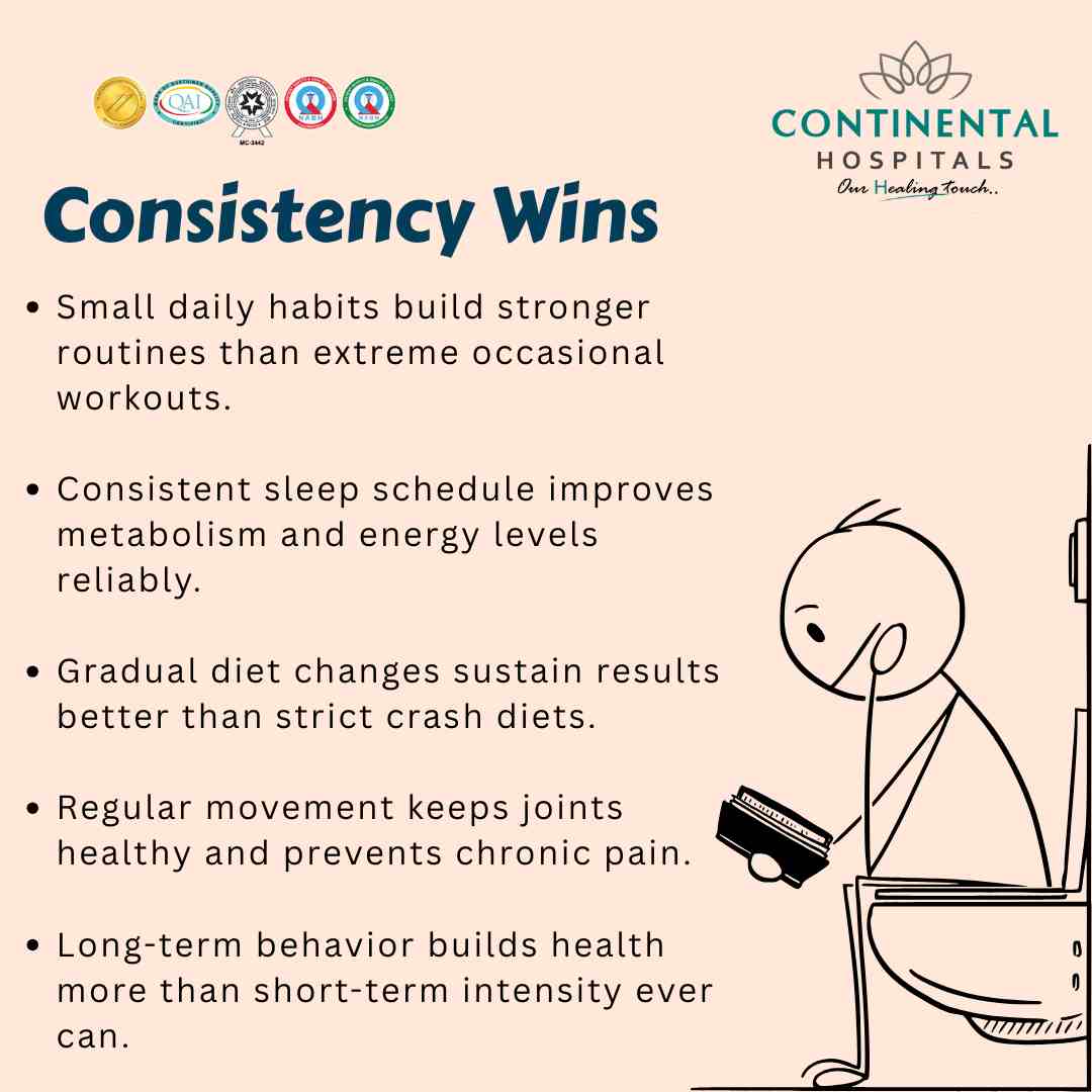 Consistency is the true key to long-term health success. Small daily wellness habits, slow and steady routines, and sustainable fitness habits shape a healthier future. Intensity may seem attractive, but only consistency creates lasting change. Start small, stay regular, and build a lifestyle that supports your body every day.