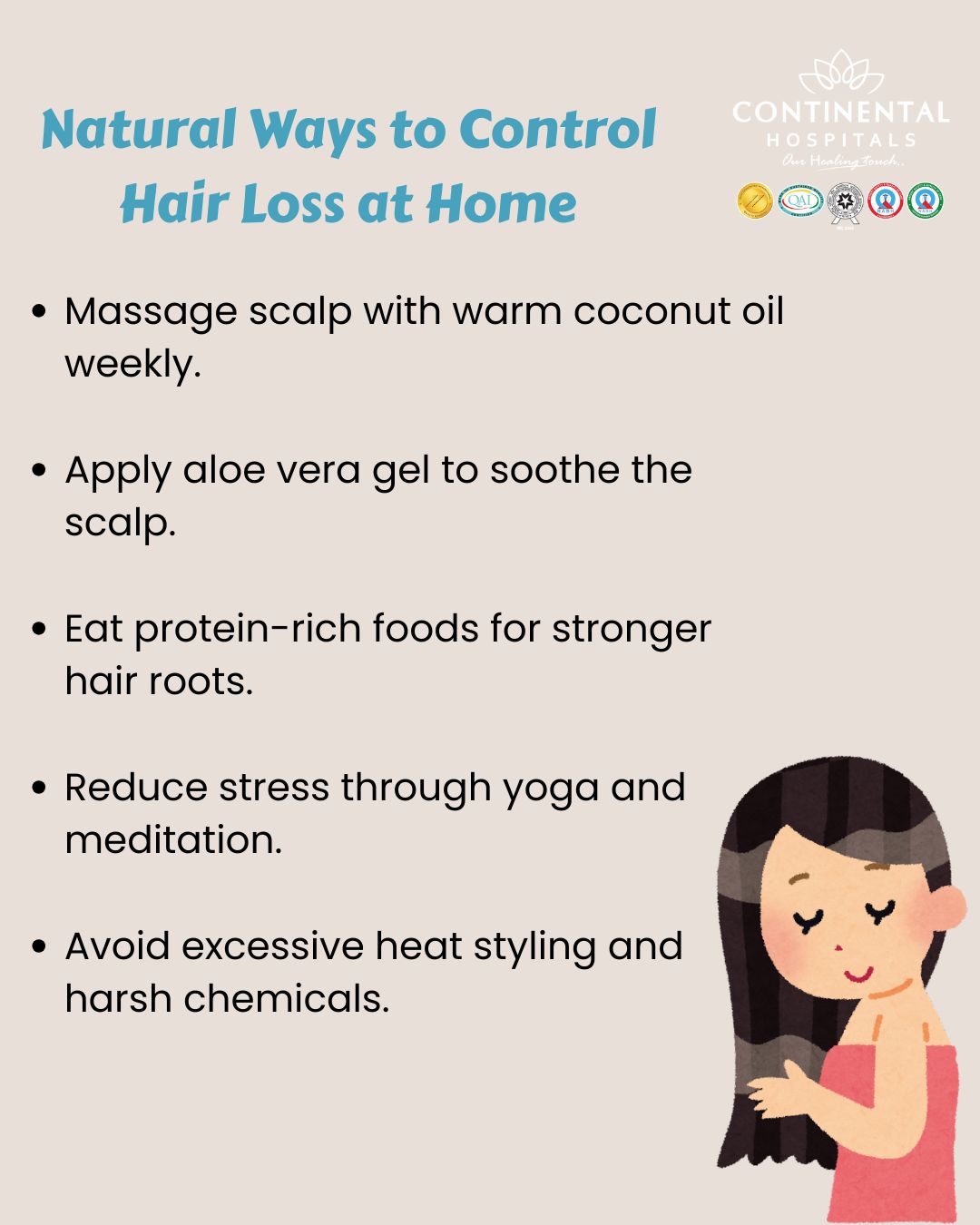 However, if hair loss continues despite trying natural remedies, professional medical guidance is essential. Continental Hospitals, the Best hospital in Hyderabad, provides advanced Dermatology care with NABH and JCI accredited standards. With experienced specialists and modern facilities, patients receive comprehensive evaluation and effective treatment.