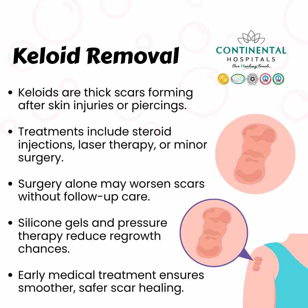 If you are seeking safe and advanced treatment for keloid scars, book a consultation with the dermatology experts at Continental Hospitals, Hyderabad. Our experienced team offers effective, personalized care to help you restore your skinâs natural appearance and confidence.