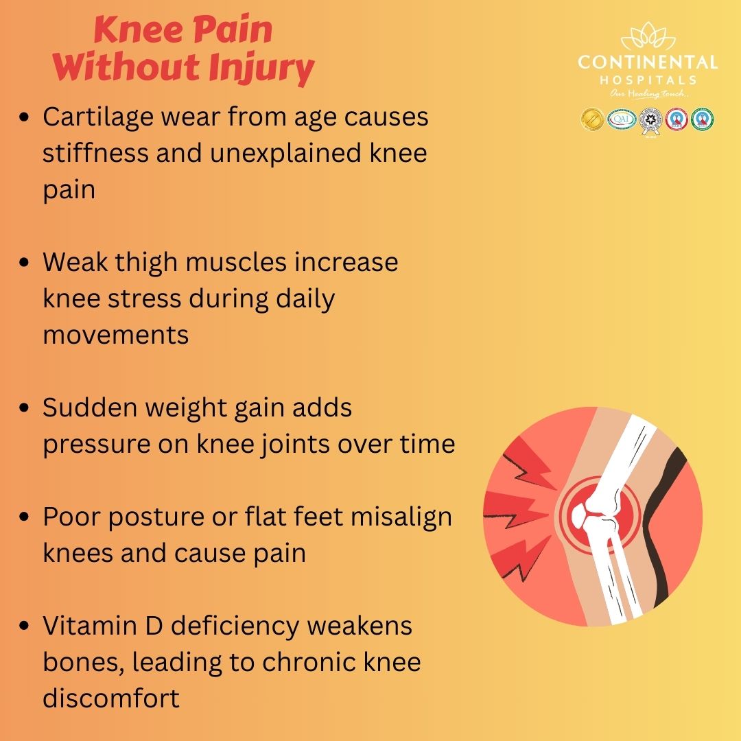 Knee pain without injury refers to pain, stiffness, or swelling in the knee joint that develops without a clear traumatic event. There is no recent fall, accident, or sports injury, yet the pain persists or keeps returning.