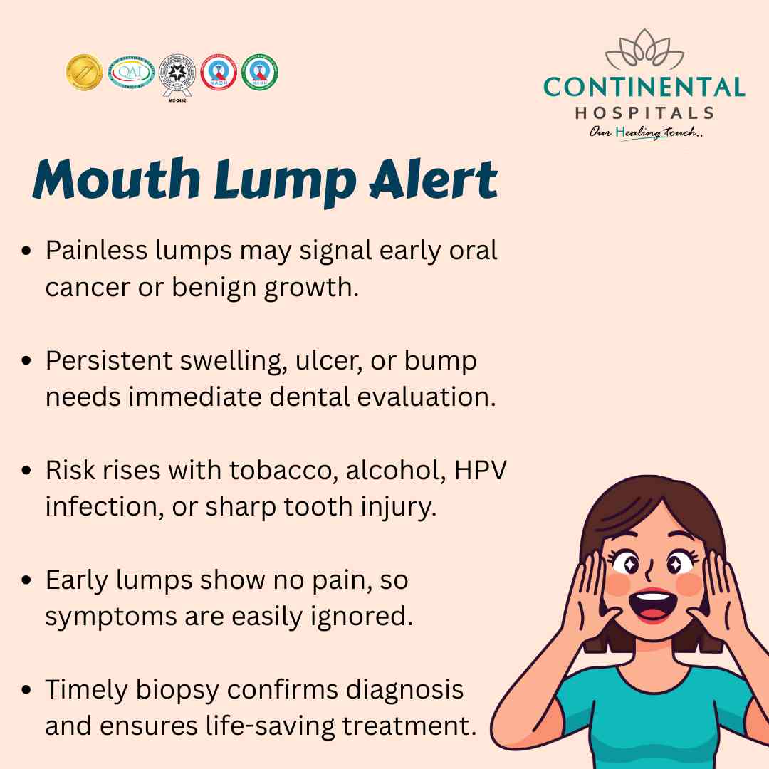 If you are suffering from a painless lump in the mouth or any oral or head and neck concern, consult our expert ENT Specialists and Head & Neck Surgery Specialists at Continental Hospitals for accurate diagnosis and advanced treatment. Your health and safety are our priority.