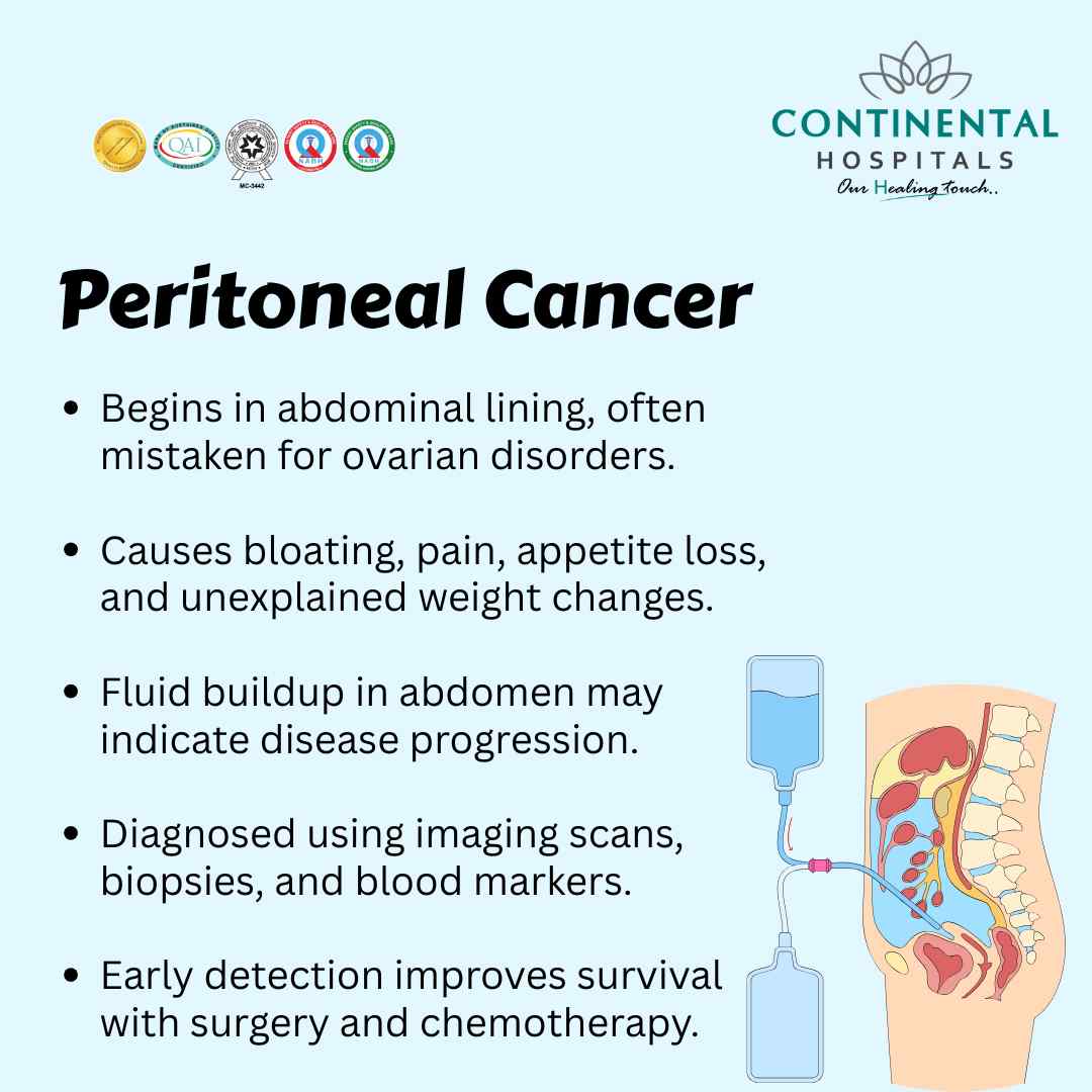 Peritoneal cancer may be rare, but early detection plays a key role in improving outcomes. Understanding symptoms like abdominal bloating, pain, or changes in appetite can prompt timely medical attention. Modern medicine, especially with advanced diagnostic and surgical techniques available at Continental Hospitals, Hyderabad, offers new hope for patients diagnosed with this condition.