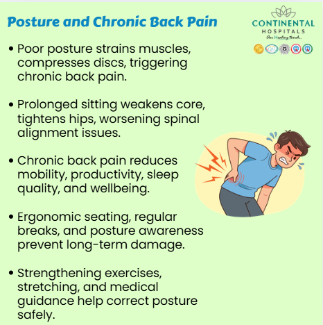 At Continental Hospitals, Hyderabad, doctors frequently see patients whose chronic back pain started with simple posture problems. The good news is that posture related back pain can be prevented, managed, and relieved with the right guidance and care.