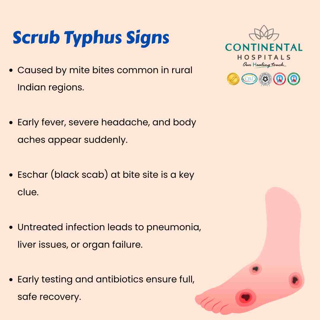 Scrub typhus India continues to be a significant cause of fever, especially in rural India infections affected regions. The infection is treatable, but only when recognised early. Understanding scrub typhus early symptoms, staying alert to mite bite infection risks and seeking prompt medical care can protect you and your family. Continental Hospitals provides specialised care, trusted diagnosis and expert treatment for all types of tropical infections India encounters.