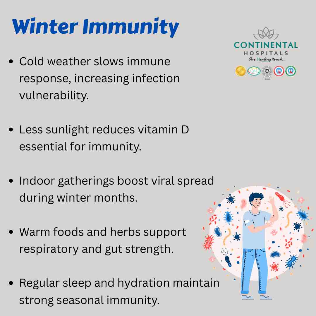 Winter is a time when the body works harder to stay warm, fight infections, and maintain energy. As the temperature drops, viruses spread easily, immunity becomes weaker, and people of all age groups face a higher risk of respiratory infections, throat problems, digestive issues, and fatigue. Understanding why winter needs extra care and how to protect your immune system can help you stay healthy throughout the season. This article explains practical winter immunity tips, natural boosters, diet recommendations, vaccines, sleep habits, air quality guidance, and when to seek medical help. All information is prepared in a simple and SEO friendly format for readers of Continental Hospitals.