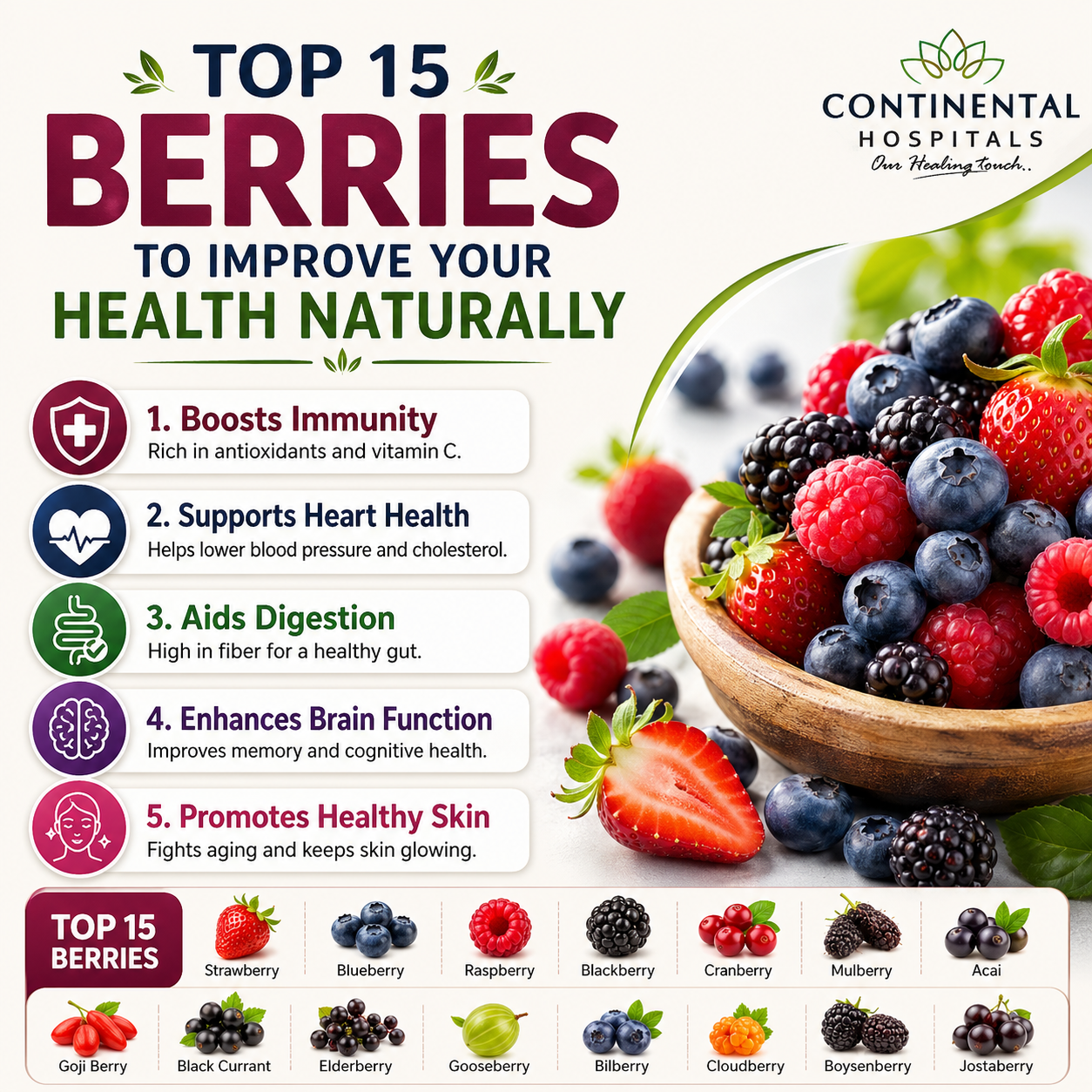 Embracing a diet rich in berries is one of the easiest and most effective ways to improve your health naturally. These small fruits offer a massive return on investment for your physical and mental well-being. Coupled with the expert care available at Continental Hospitals, you can ensure a long, healthy, and vibrant life.