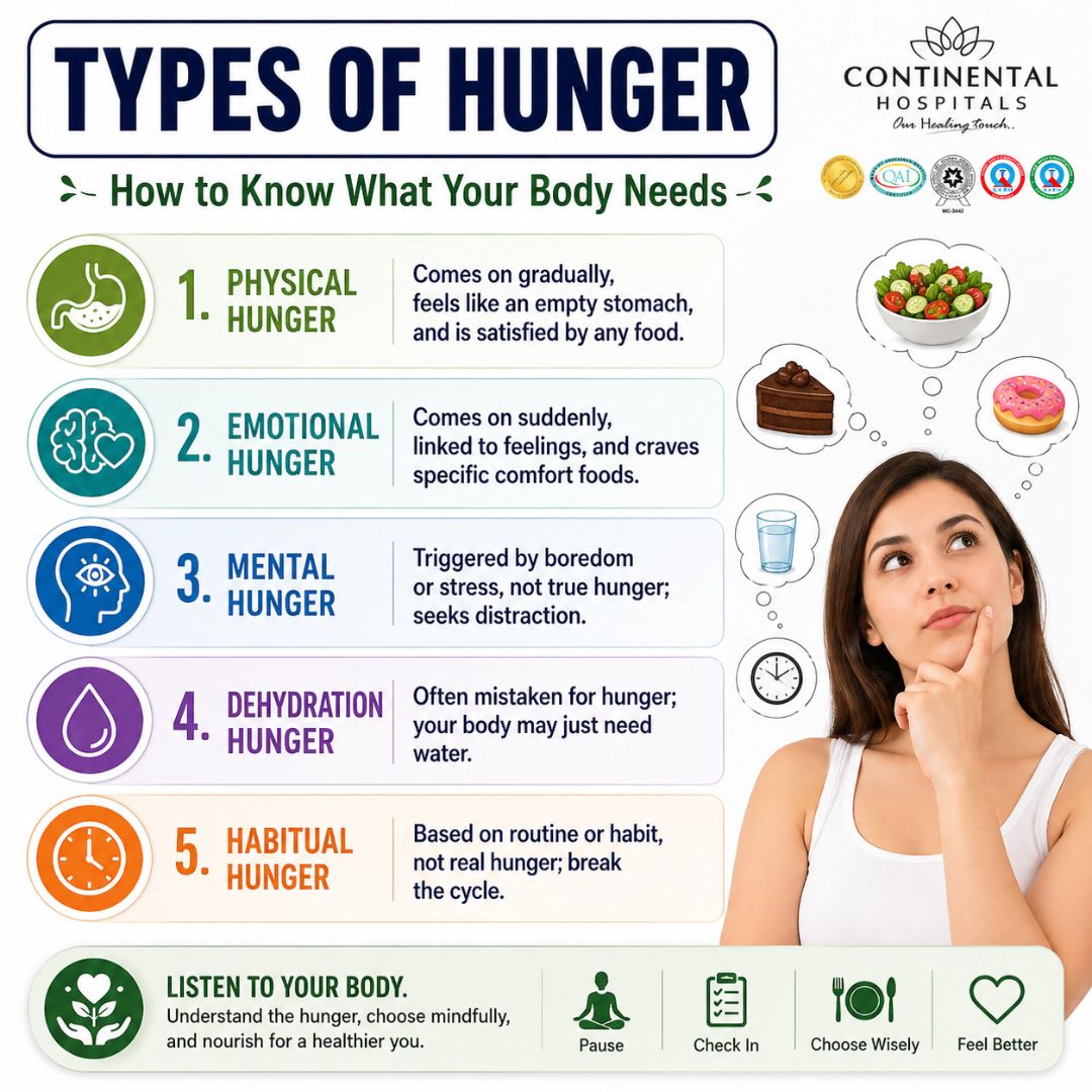 Constant hunger or weight changes? Visit our Nutrition & Dietetics department at Continental Hospitals, Hyderabad for expert evaluation and care.
