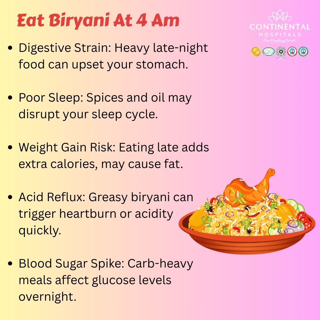 Occasional early morning biryani is unlikely to cause major harm. But frequent late night eating can affect long term health.