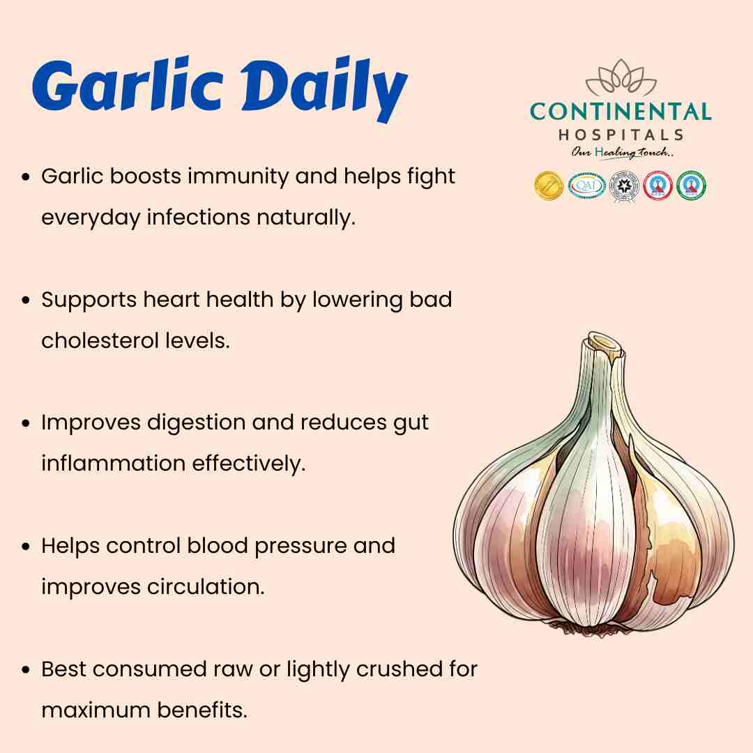 Garlic encourages the liver to release natural enzymes that help in detoxification. It supports liver cells and protects them from harmful toxins. People with fatty liver or those at risk of liver disease may benefit from adding garlic to their diet along with guidance from a doctor. Continental Hospitals Hyderabad has experienced specialists who offer personalised liver care and advanced treatment options.