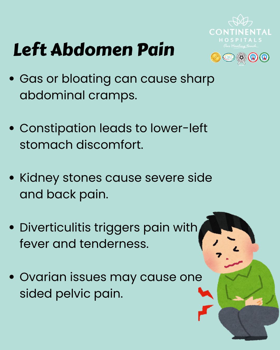 If you suffer from repeated bottom left tummy pain, abdominal cramp left side, or ongoing discomfort on lower left side of abdomen, consult the expert gastroenterologists and specialists at Continental Hospitals. Our team provides accurate diagnosis and advanced treatment for digestive, kidney, and abdominal conditions.